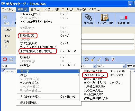 •     本文中で画像を表示する場所をクリックし、[編集]>[挿入]>[ファイルの挿入]を選択する