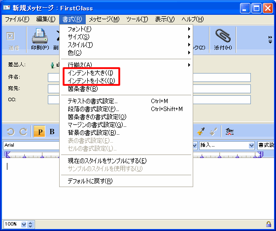 • [書式]>[インデントを大きく]を選択して次のタブ位置にインデントを設定するか、[書式]>[インデントを小さく]を選択してインデントを直前のタブ位置まで戻す
