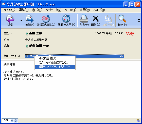 FirstClassでは、添付ファイルをダウンロードする前にプレビュー表示できます。プレビューを見るには、コンテキストメニューから[選択したアイテムを開く]を選択してください。画像ファイルやファックスが画像ビューア
