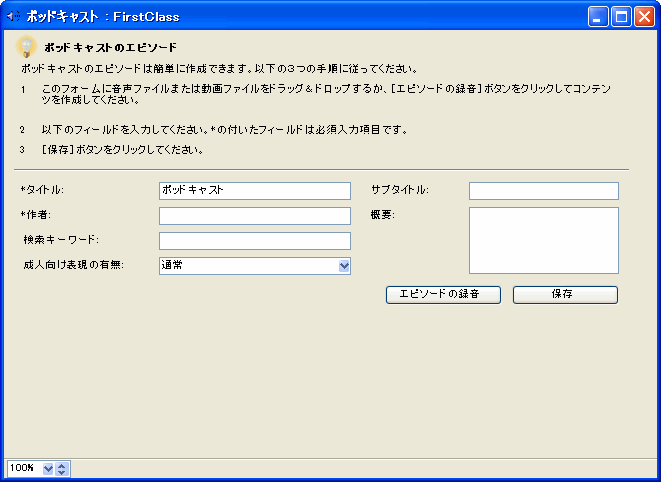 オーディオファイルまたはビデオファイルを[ポッドキャストエピソード]フォームにドラッグしてください。