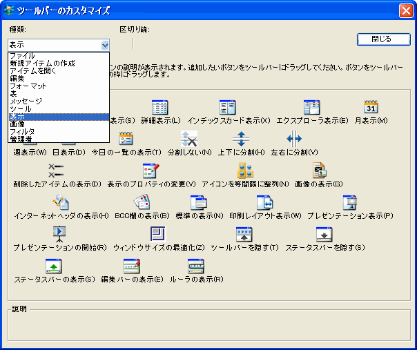 すでにツールバー上にあるボタンと同様に、[ボタン]欄にあるボタンにはボタン名を表すツールチップがあります。また、詳しい説明が[説明]欄に表示されます。