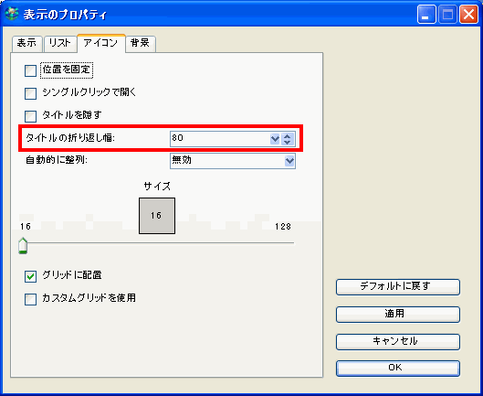 有効にするには、表示のプロパティの[タイトルの折り返し幅]で、アイコン名が表示される行の最大ピクセル数を指定してください。