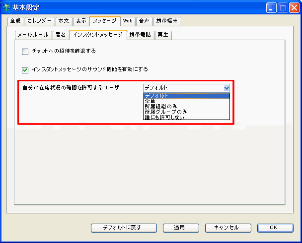 自分がいつ在席しているかを他のユーザに知られたくない場合は、この情報を参照できるユーザを制限できます。これを行うには、インスタントメッセージの基本設定にある[自分の在席状況の確認を許可するユーザ]で、在席確認の表示を許可するユーザのグループを選択してください。