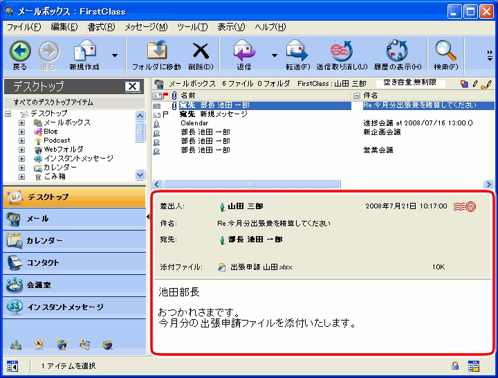 閲覧ペインには、メインペインで選択したオブジェクトの内容が表示されます。例えば、メッセージやドキュメントを選択すると閲覧ペインに表示されます。