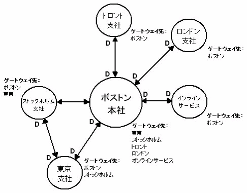 ストックホルム支社のサーバとボストン本社のサーバには互いを直接結ぶゲートウェイがありますが、この2つのサーバのディレクトリは東京支社のサーバ経由で複製されるため、複製ループは起こりません。