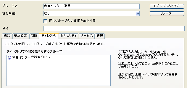 ディレクトリ閲覧制限を設定するには、[グループ権限]フォームの[ディレクトリ]タブ、または[ユーザ情報]フォームの[ユーザグループ/ディレクトリ]タブで、特定のユーザグループまたはユーザ に閲覧させたいユーザグループを選択してください。