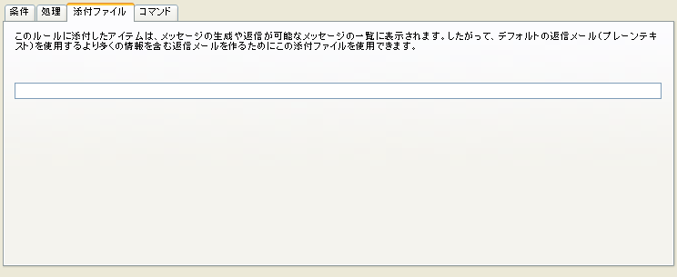 例えば、返信メッセージにファイルを添付する場合に、プレーンテキスト、書式設定したテキスト、画像を貼り付けたオブジェクト(通常はメッセージかドキュメント)などを添付できます。ファイルをアップロードして返信メッセージに添付したい場合は、先にそのファイルを添付してから、そのファイルを該当するルールで選択してください。