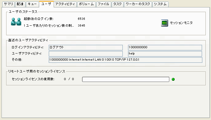 使用中のセッションライセンス(現在ログイン中のリモートユーザ)の合計数、および設定されているすべてのセッションライセンスの合計数です。正常な範囲で使用されている場合はランプが緑色に、利用可能セッション数の90パーセントに達した場合は黄色に、100パーセントに達した場合は赤色に点灯します。このランプは、[LEDのリセット]をクリックするまで、使用中のセッション数が最も多いときの状態のままになります。