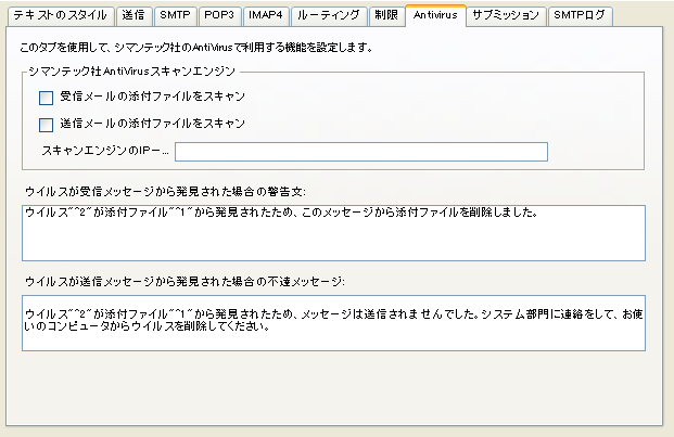 このタブを使用して、ご利用のシステムでシマンテック社のAntiVirusスキャンエンジンを利用するための設定を行います。