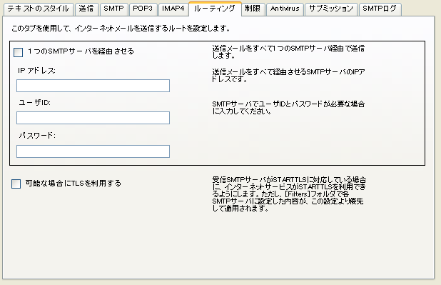 [IPアドレス]で指定したサーバにすべての送信メールをルーティングします。以降のルーティングはすべてこのサーバ上で行われます。