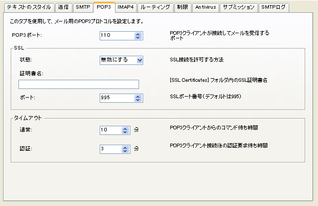 POP3クライアントからのコマンドを待機する時間です。デフォルト:10分