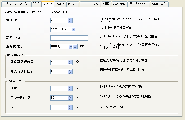 SMTPサーバからのコマンド、またはSMTPサーバに送信したコマンドへの応答を待機する時間です。この時間を過ぎると接続を切断します。デフォルト:3分