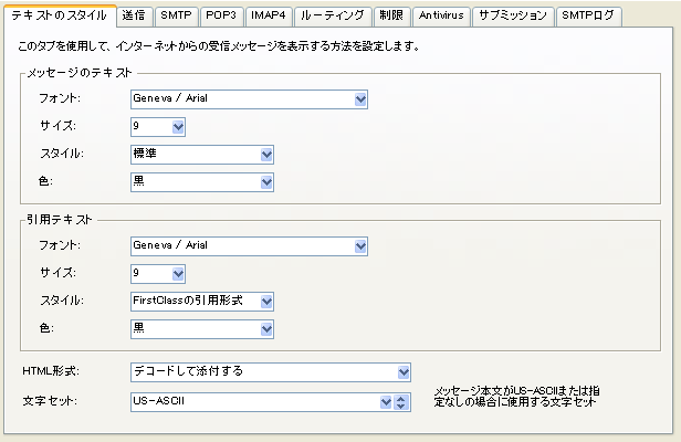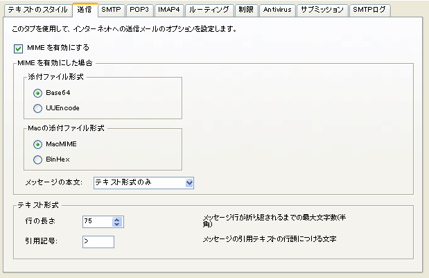 MIMEを有効にしなかった場合、またはMIMEを有効にした状態で[メッセージの本文]の[テキスト形式のみ]を選んだ場合は、次のオプションを設定してください。