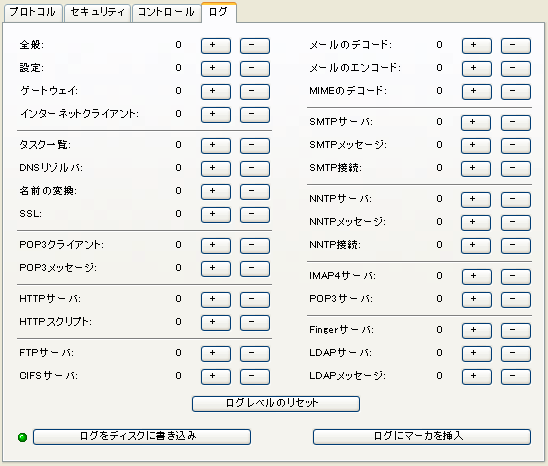 [更新]ボタンを押すと、インターネットサービスが設定フォーム(InetSvcs.cf)を再読み込みします。 注意FirstClassは、数分おきに設定フォームを自動的に再読み込みします。このボタンは、今すぐ再読み込みをしたい場合にクリックしてください。このボタンは、以前の[設定の再読み込み]ボタンに代わるものです 設定の再読み込み中は、インターネットモニタのステータスランプが黄色になります。 [ログをディスクに書き込み]ボタンは、トラブルシューティングで必要になる場合があります。 ヒントログレベルは、問題を特定するため