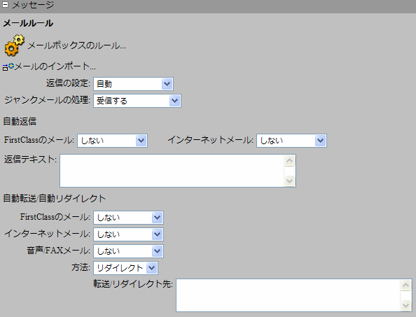 該当する種類の全メールに対して自動転送または自動リダイレクトを行います。