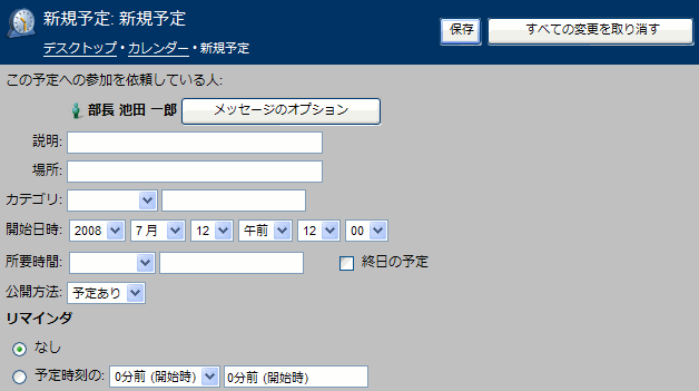 このセクションを使用して、ユーザへの予定参加の依頼と備品や場所の予約を行います。予定の再調整もこのセクションで行います。