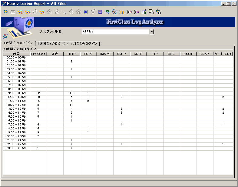 選択したプロトコル経由でFirstClassに同時ログインされた数の最大値です。このログインが起こった時間帯(1時間単位)も表示されます。