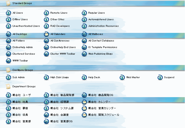 • 部課グループ群にあるすべてのユーザグループ、コンテナ用テンプレート、およびカレンダーグループの名前を、親会社用に変更します。例えば、[Employee]グループは[親会社 社員]に、[Finance]は[親会社 経理課]のような名前に変更します。親会社が利用するグループをすべて[Groups]フォルダ内の片側に寄せて、システムの規模が大きくなってもグループ作成が簡単に行えるようにするとよいでしょう。