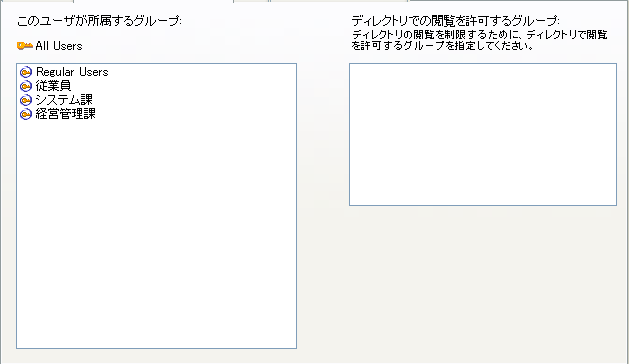 • ・標準グループ群、設定グループ群、ディレクトリ閲覧制限グループ群に属するグループは、どれも変更しないでください。これらのグループに対して設定を加えたり変更したりすると、システムに登録されている該当ユーザすべてに適用されてしまいます。