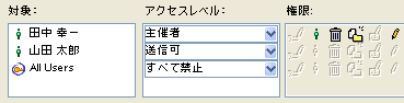 [対象]の最後に[All Users]グループを登録して、その[アクセスレベル]を[すべて禁止]にしておくとよいでしょう。これにより、未登録ユーザがこのシステムにアクセスしても、会議室や会議室内の情報にはアクセスできないようにすることができます。