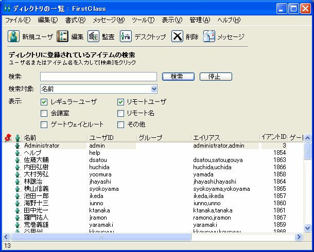 ユーザは、FirstClassディレクトリのエントリを調べて、メールの宛先に指定するユーザ名や会議室名を検索できます。ディレクトリは、メニューバーから[ツール]>[ディレクトリ]を選択して表示させることができます。