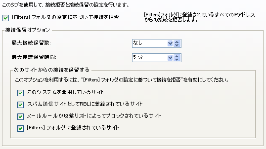 不必要な接続を保留するには、[インターネットの基本設定]フォームの[接続]タブで、[[Filters]フォルダの設定に基づいて接続を拒否]を有効にし、対象のIPアドレスを[Filters]フォルダ内のフィルタリング用ドキュメントに登録する必要があります。その設定が完了したら、[接続]タブの[接続保留オプション]でパラメータを設定します。