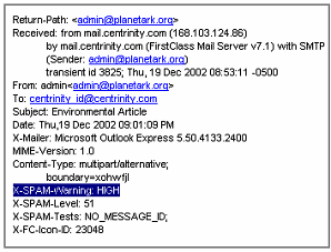 そのユーザは、このメッセージのインターネットヘッダを表示してスパムレベルを確認し、そのメッセージがスパムと判定された理由を調べることができます。下図は、X-SPAM-warningヘッダが「HIGH(高)」になっているメッセージのインターネットヘッダの例です。