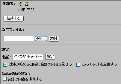 インスタントメッセージに名前を付けるには、[設定]をクリックしてください。この名前が、ユーザが他のユーザに送信した招待に表示されます。この名前は、会話内容を保存する場合に、インスタントメッセージの件名にも使用されます。 |