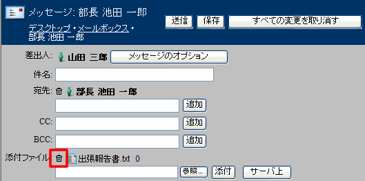 添付したファイル (ファイルが[添付ファイル]の入力フィールドではなく宛先領域に直接表示されている) |