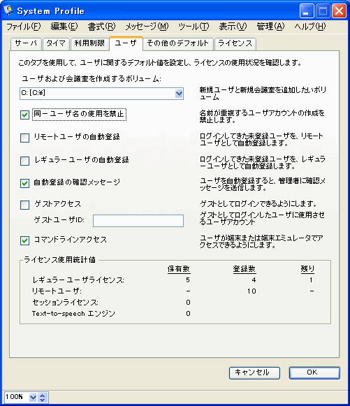 このタブを使用して、ユーザに関するデフォルト値の設定と、ライセンスの使用状況の確認を行います。