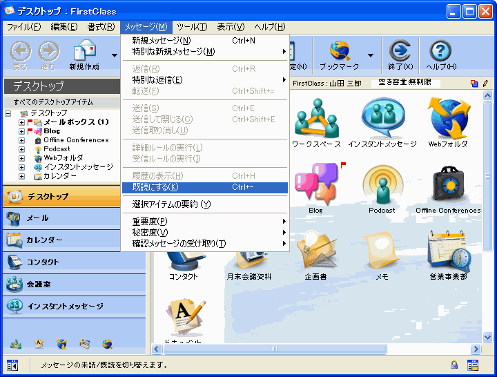このアイコンがまだ選択されている状態で[メッセージ]>[未読にする]を選択すると、会議室内のメッセージまたはメールボックスに送信されたメッセージが、未読でなかったものも含めてすべて未読になります。