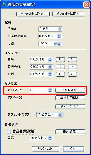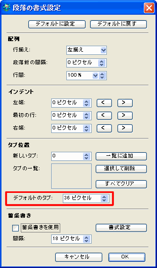 2       [デフォルトのタブ]で、タブ位置の間隔をピクセル単位で入力します。