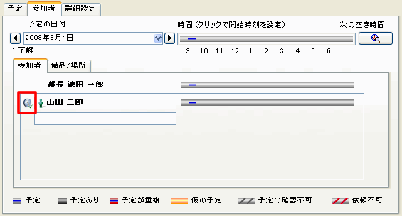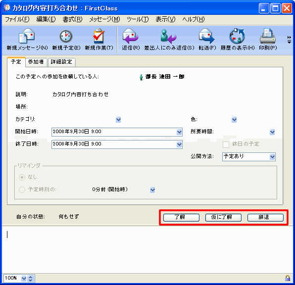 参加依頼したユーザが同じサーバ上にいない場合、そのユーザにはこのアイコンは表示されず、予定の履歴にも依頼を了解したか辞退したかを示す情報は記録されません。そのため、必ず依頼者に対する返信メッセージが作成されます。