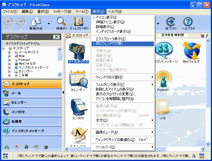 FirstClassでは、すべてのアプリケーションやコンテナを、FirstClass起動時に表示されるメインのウィンドウに表示させることができます。新規メッセージや[基本設定]フォームのようなフォームなど、特定のオブジェクトは新しいウィンドウで開くこともできます。