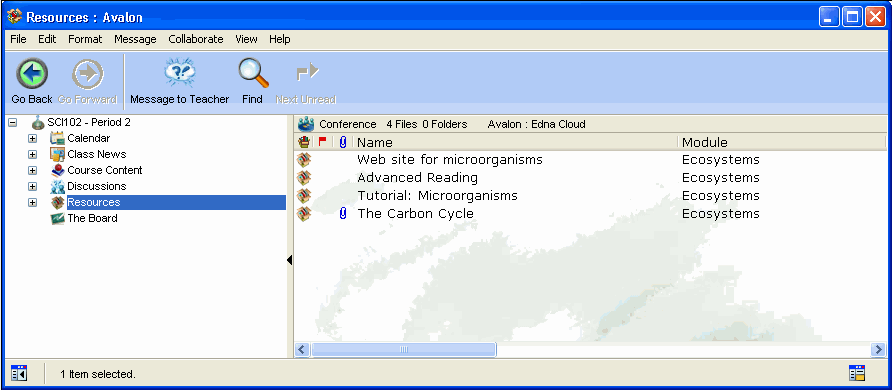 From your My Classes area, you can access the Discussions area within each class. It is here that you can talk to the teacher and students and continue your classroom discussions -- from the comfort of your home, or any location where you have an Internet connection and a FirstClass ED client.