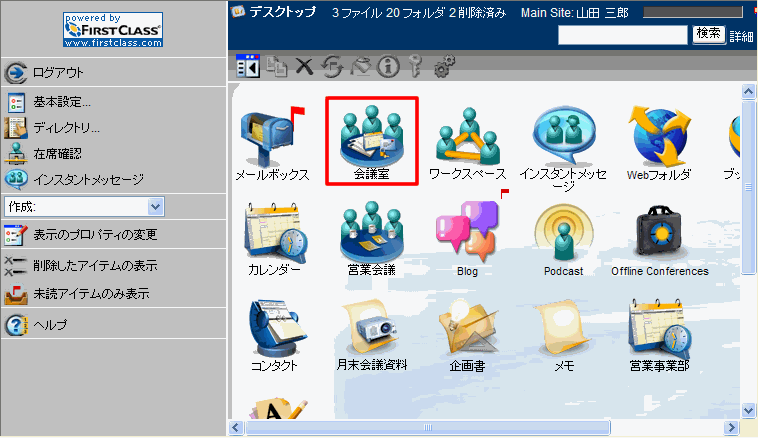 会議室では、多数のユーザがオンラインで情報をやり取りできます。ユーザは、メッセージを他のユーザに送信するのと同じ要領で、会議室宛にメッセージを送信できます。また、会議室を開いて、他のユーザが投稿したメッセージを読むこともできます。会議室に未読メールがある場合は、会議室アイコンにフラグが表示されるとともに、その未読メールの数が表示されます。
