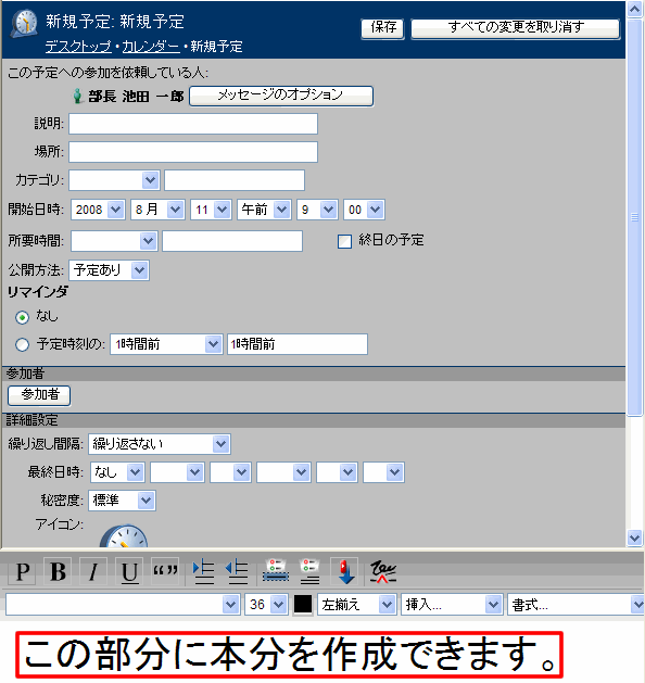 ドキュメント、メッセージ、カレンダーの予定と作業などのFirstClassオブジェクトでは、そのオブジェクトのメッセージ領域(下部ペイン)に本文を入力できます。この本文には、テキスト、貼り付け画像などのファイル、水平線、改ページ、マーカ、およびリンクを含めることができます。また、本文の追加、編集、書式設定もできます。