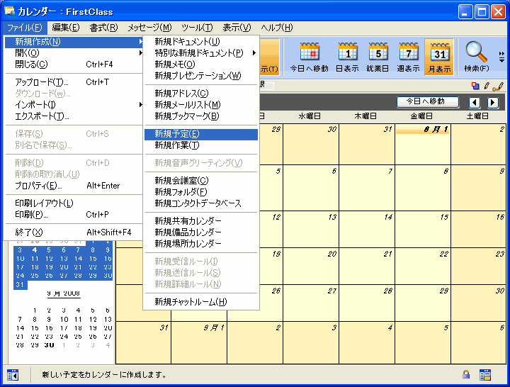 2 [ファイル]>[新規作成]>[新規予定]を選択します。