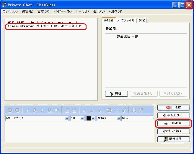 インスタントメッセージセッションを終了する場合は、[インスタントメッセージ]フォームを閉じてください。退席したことは、他の参加者に通知されます。20100529_155110_2.png