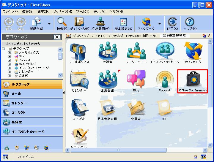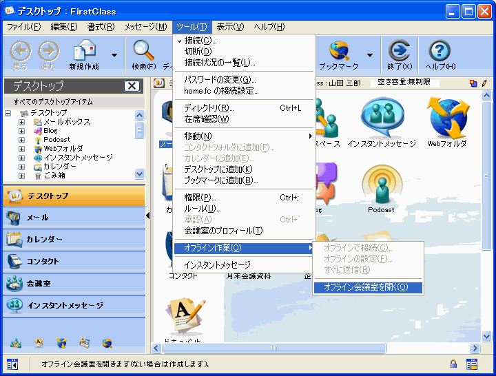 2       FirstClassパーソナルを起動していない場合は、[ツール]>[オフライン作業]>[オフライン会議室を開く]を選択します。