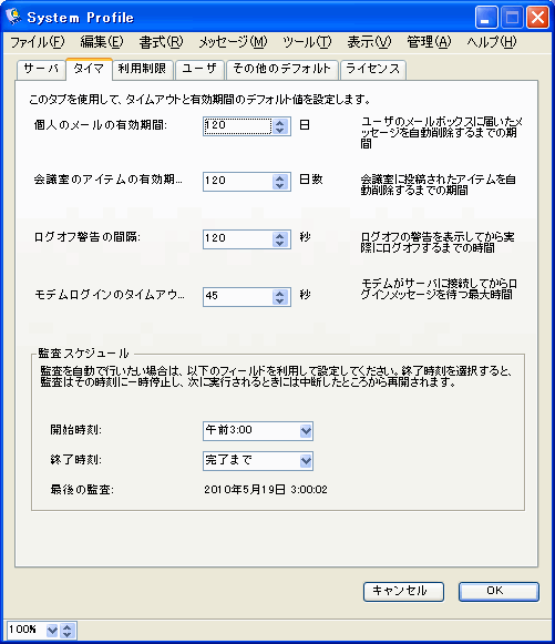 この監査によって、ユーザが削除したファイルが完全に消去されます。また、損傷したファイルの修正作業が行われます。ユーザが利用中のアイテムに対して監査を行うことはできないため、利用ユーザの少ない時間帯に監査のスケジュールを設定することをお勧めします。