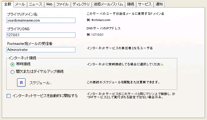 インターネットサービスの責任者の名前を入力します。Postmaster宛のインターネットメールはすべて、ここで設定した責任者のメールアドレスに届きます。この欄には管理者を設定するのが普通ですが、Web管理者用の独自メールアドレスを作成することをお勧めします(例えば、webadmin@huskyplanes.com)。こうすれば、管理者のアドレスをこの欄に設定した場合とは異なり、インターネットの管理作業とサーバの管理作業とを分けることができます。デフォルト:Administrator