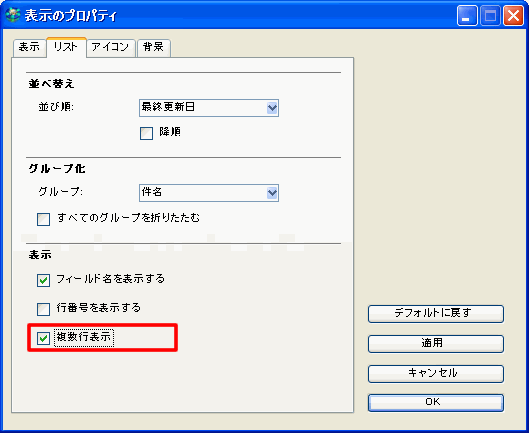 1行に納まらないテキストを途中で切らずに次の行に折り返すには、[表示のプロパティ]フォームの[表示]タブで[複数行表示]を選択してください。