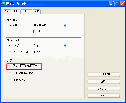 デフォルトでは、詳細表示の各列の先頭には見出しが表示されています。列見出しを表示しないようにするには、[表示のプロパティ]フォームの[表示]タブで[フィールド名を表示する]の選択を解除してください。