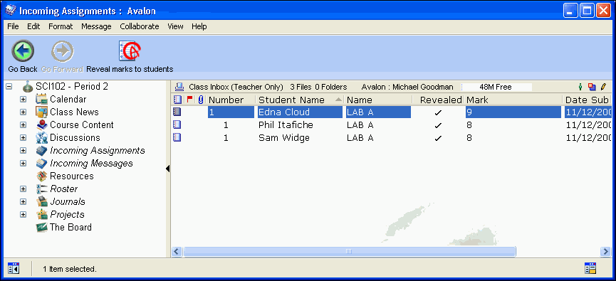 From the Incoming Assignments area, the teacher can open any submitted assignment, assign a mark and add comments directly in the body of the message. The teacher controls when the assignment is revealed to students. If she wishes, she can reveal all of the marks at once.