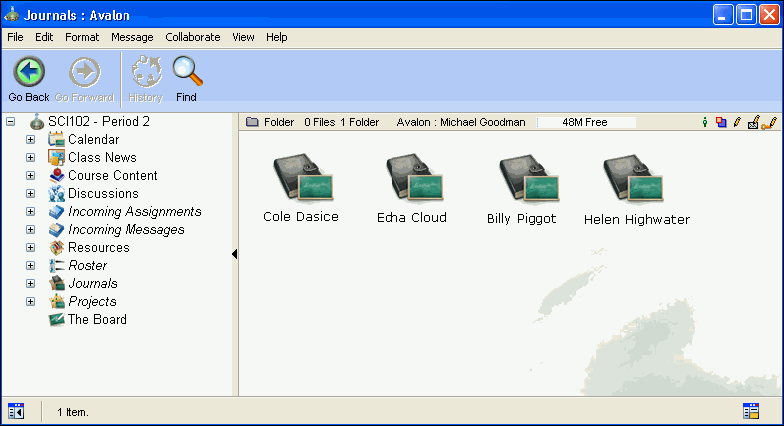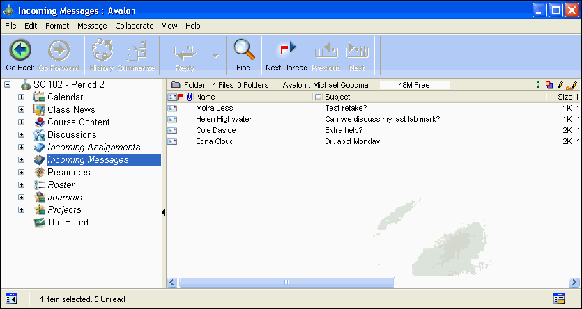 In addition to the public area of the class, the teacher has additional areas that are private to her own view: an Incoming Assignments area, Incoming Messages area, Roster, Projects area and Journals area. Also, unpublished assignments and lessons can be maintained in the Course Content area. These lessons and assignments are not visible to students until the teacher publishes them.