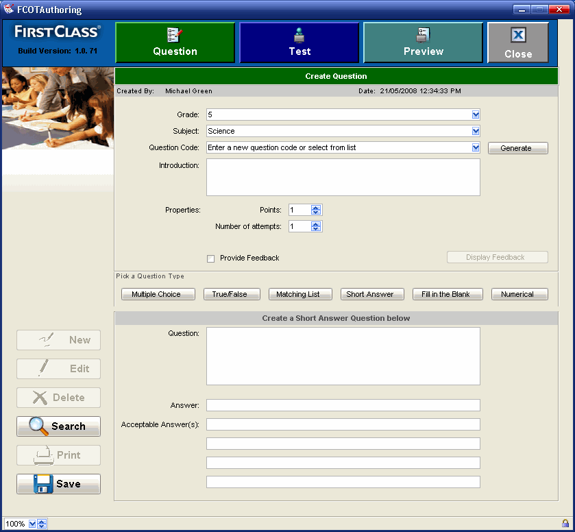 FirstClass Testing is an application comprised of three tools: Authoring, Testing, and Reporting. The AUthoring and Reporting tools reside on your FirstClass ED Desktop. The Testing tool resides on students' FirstClass ED Desktops.