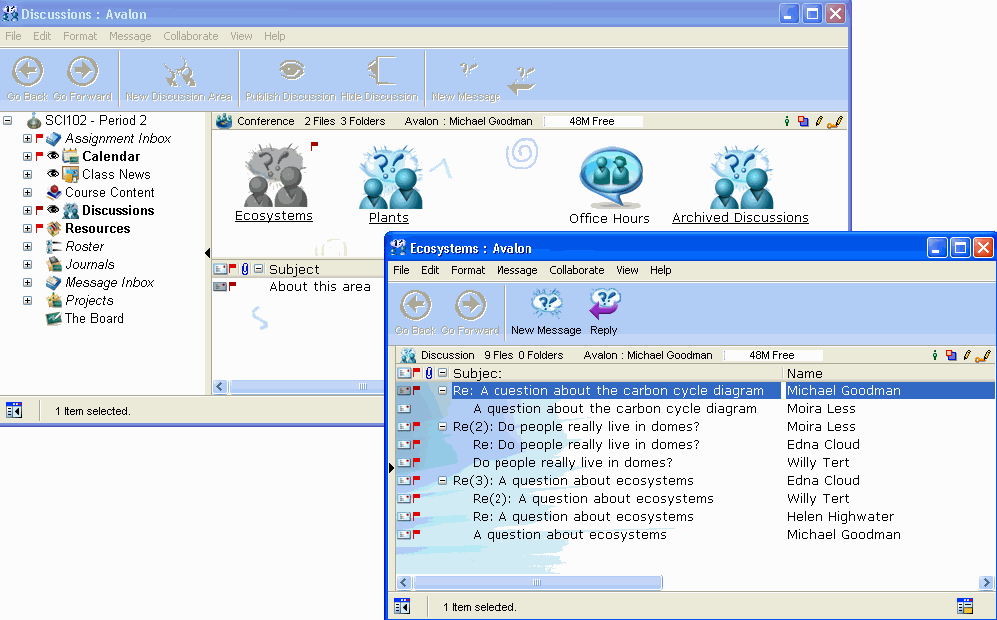 In addition to discussions in the classroom, you can post questions in the Discussions area of your FirstClass ED classroom and monitor the student responses. Students have a venue to discuss classroom topics at any time, at their convenience. Even shy students are likely to contribute because they feel more comfortable in this online environment. This is an effective way for students to elaborate on each others' answers, and for you to see who is contributing and who may need more attention.