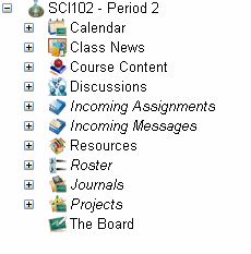 In addition to the public area of the class, the teacher has additional areas that are private to her own view: an Incoming Assignments area, Incoming Messages area, Roster, Projects area and Journals area. Also, unpublished assignments and lessons can be maintained in the Course Content area. These lessons and assignments are not visible to students until the teacher publishes them.