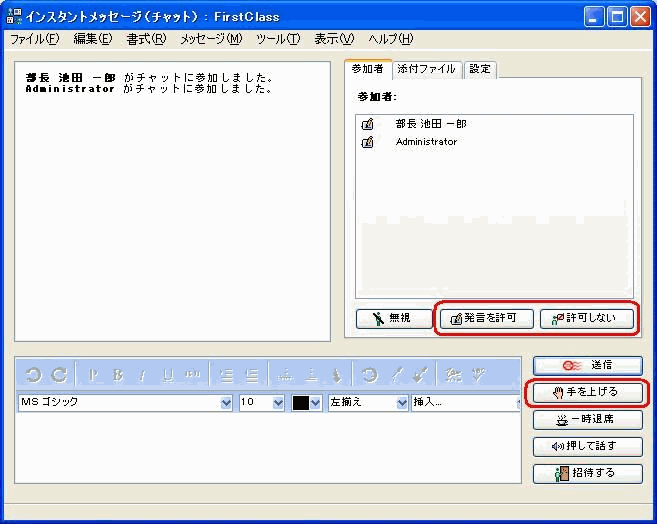 2102006_35208_0.png主催者のいる個人用インスタントメッセージでは、インスタントメッ セージの作成者だけが他のユーザの発言を許可できます。主催者のいる公開チャットルームでは、主催者だけが他のユーザの発言を許可できます。